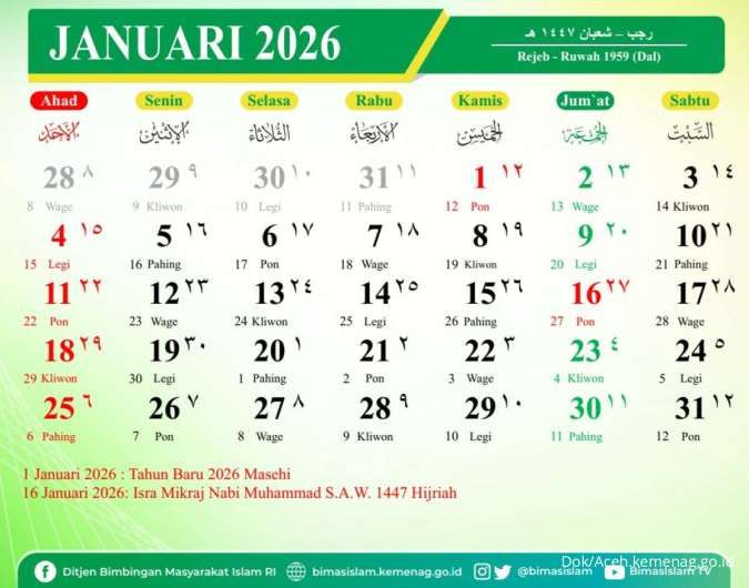 Kira-kira seperti apa kalender Jawa di bulan Januari ini? Mengutip dari situs Kalenderjawa.id, inilah daftar bulan Januari 2026 di kalender Jawa lengkap informasi neptu, wuku, dan warsa.